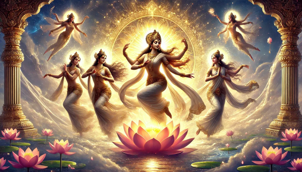 The Asparas are described as beautiful nymphs associated with water and clouds, who wear graceful flowing garments and dance in Indra’s heaven. The Ten Mahavidya, on the other hand, are the shakti powers identified as Kali, Tara, Tripura, Sundari, Bhuvaneshvari, Bhairayi, Chhinnamasta, Dhumavati, Bagalamukhi, Matangi, and Kamalatmika. In Shaktism, they are said to represent “the one Truth sensed in ten different facets; the Divine Mother as ten cosmic personalities,” the Dasa-Mahavidya (ten-Mahavidyas).