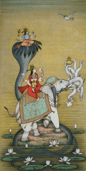 I identified Vishnu as the Hindu representation of the Bridegroom because, in the story of the churning of the ocean, Lakshmi chooses Vishnu as her future husband upon emerging from the waters, knowing that their union will restore cosmic harmony, balance, and the reciprocal devotion existing between God and his creations. Below, we see a depiction of their marriage ceremony with Lakshmi riding Airavata, and Vishnu seated on Shesha.