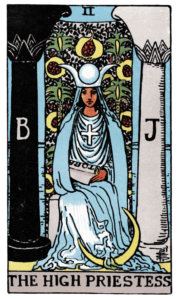 In the Abrahamic religions, she’s the bull-headed cherubim or throne-bearer presiding over the final quadrant of Moksha. In ancient Egypt, she was called Hathor. In ancient Mesopotamia and Judea, she was called Moket, but was vilified in the Old Testament through mistranslation and ignorance of her true identity. In the RWS Tarot, she’s THE HIGH PRIESTESS, seated between the Temple pillars, Boaz and Jacim.