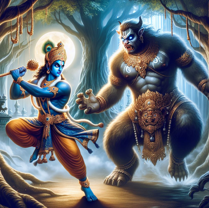 Through misplaced presumption and innuendo, Krishna was blamed for Prasena’s disappearance. To prove his innocence, Krishna set out to find the king and the jewel. Following Prasena’s trail, Krishna discovered the bodies of the king and his horse, along with evidence of a lion attack. He then followed and found the dead lion, and then followed the trail of the bear to the entrance of a cave, where the bear’s children were playing with the jewel. To recover the gem, Krishna challenged Jambavan to a fight that went on for 28 days before the bear grew too fatigued to continue. Knowing no ordinary mortal could defeat him, Jambavan realized he had been sparring with Vishnu unawares. So, he surrendered the fight and the jewel to Krishna, and also gave Krishna his daughter, Jambavati (the fruit of the tree of having), in marriage.