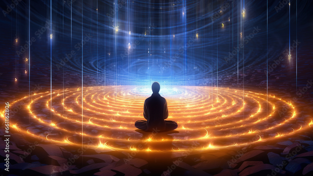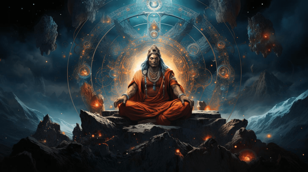 The light of the ultimate now-moment (the Holy Instant) speaks the Om to yoke the celestial cistern of divine thought, Hari, together with the eight shaking the almsgiving ritual of God’s one hundred eyes to disappear duality.