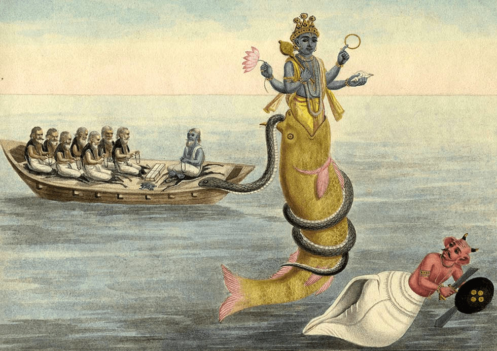In the Bible’s counterpart-allegory of Noah’s Ark, it is YHVH who speaks to Noah, affirming my interpretation of what both the fish in this verse and Matsya represent. In the Hindu story Manu eventually realizes that Matsya is Vishnu, so YHVH, the Name of God in Israel, is probably the Holy Spirit “in two streams.” In this case, YH (the spark of the Holy Spirit) and VH (the yoke of the Holy Spirit).